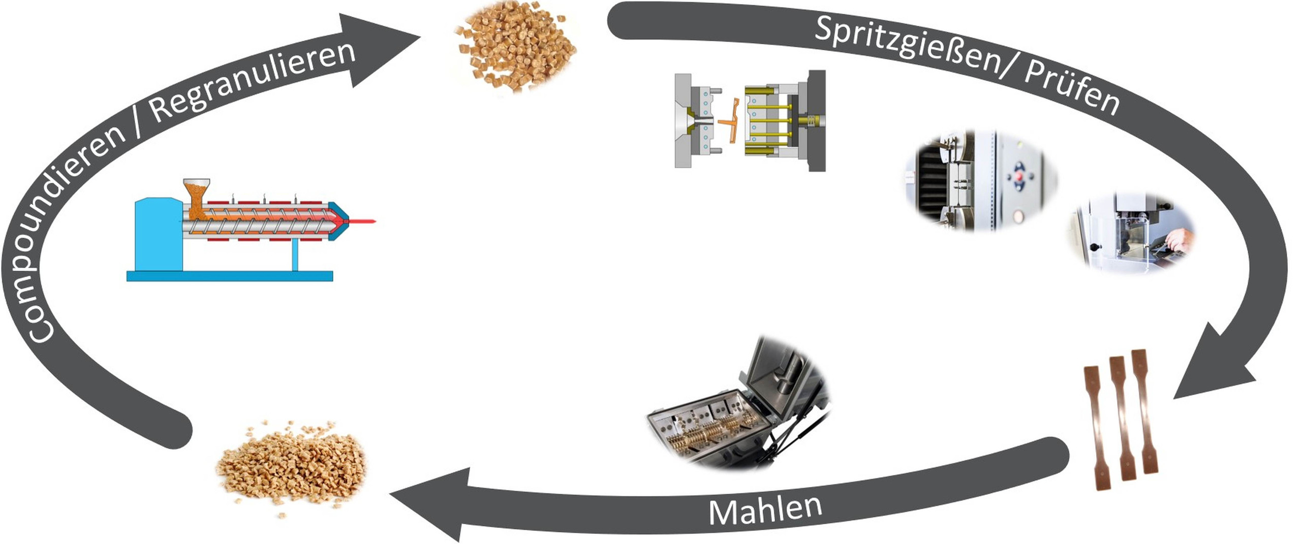 Darstellung einer Kreislaufstudie über die Verarbeitungsstufen anhand von Polypropylen mit Naturfasern.